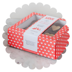 What’s in the Valentine’s Gift BoxSugar, Raspberry, Unsalted Butter (milk), Dark Chocolate (cocoa mass, sugar, cocoa butter, emulsifier: soya lecithin, vanilla extract), Egg, Ruby Chocolate (sugar, cocoa butter, skimmed milk powder, whole milk powder, cocoa mass, emulsifier: soya lecithin, citric acid, natural vanilla flavouring), Cocoa Powder (cocoa powder, acidity regulator: E501i, citric acid), Gluten Free Flour (rice, potato, tapioca, maize, buckwheat), Plant Based Butter (Sustainable palm oil*, sunflower oil, rapeseed oil, fava bean preparation, plant based emulsifier (sunflower lecithin), natural flavourings).